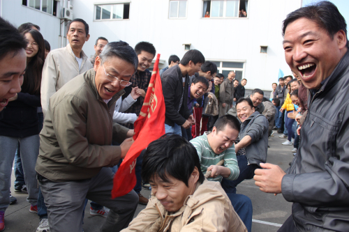拔河比賽是最考驗(yàn)團(tuán)隊(duì)凝聚力的項(xiàng)目了。裁判員一聲令下,所有的選手勁往一處使,勒緊麻繩不放松,在強(qiáng)有力的“1、2、3”的口號(hào)下,每個(gè)參賽者使出九牛二虎之力,把繩子往自家起點(diǎn)線邊拉。只見(jiàn)繩索中心的紅線忽而左忽而右,參賽選手們絲毫不放松,腿彎了、差點(diǎn)就坐在地上了,大家又一股力量地往回拉。圍觀的同事們急得直跺腳,嘴上喊著“加油、加油”,手還一直往一邊“推”,好像自己也在拉著比賽繩一樣。在這場(chǎng)力量與意志的比拼中,拓寶二、營(yíng)銷二部、草坪灌溉聯(lián)合組奪得了最后的勝利。