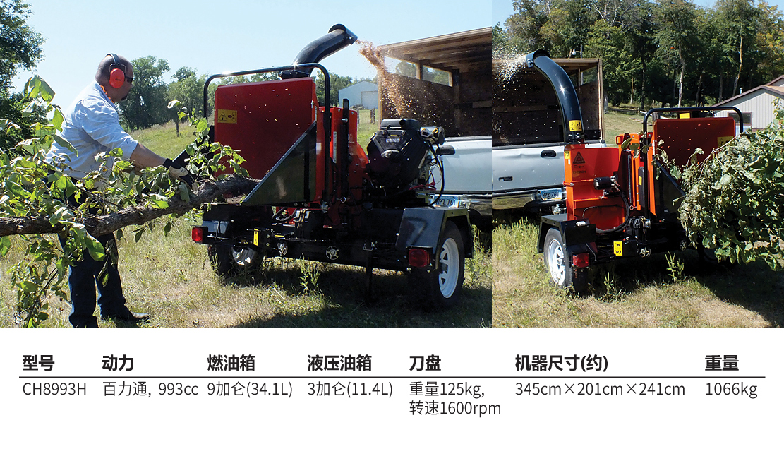 老熊(BEARCAT)品牌樹枝粉碎機,配置百力通先鋒993cc發(fā)動機,最大可切削直徑20cm樹枝。